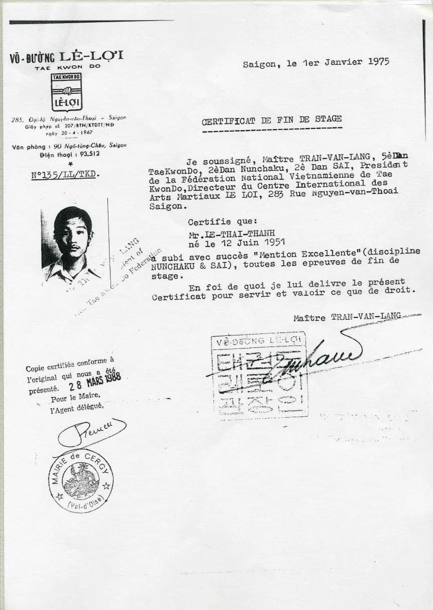 Maître LE Thai Thanh est né en 1951 à Hanoï et nous a quitté le 13 juin 2010. Il a passé son enfance au Sud-Vietnam et, à l’âge de 12 ans, devint l’élève de Maître MI à Saïgon. Celui-ci lui enseigna le « Hong Kuen », le « Wing Chun » et le « Yi-King » ainsi que le travail sur l’énergie interne. Par la suite, maître LE étudia le « Kung Fu » auprès de maître HANG Thangh puis le « Karaté Shotokan », le « Tae Kwon Do » et enfin le « Hwarang Do ».